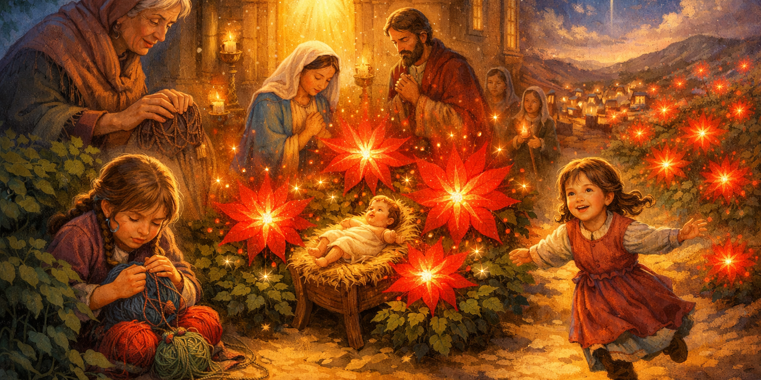 Feliz salió corriendo y vio que en todos los matorrales de la calle y las montañas, brillaban estrellas radiantes iguales a las que había en el pesebre y que su regalo se había convertido en el más resplandeciente y maravilloso de todos; desde entonces se cree que, por eso, solo florea en está época del año.